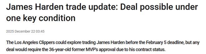 北京时间12月22日,快船队有可能在2月6日交易截止日前寻求交易詹姆斯-哈登,但受其合同条款限制,这笔交易必须得到哈登的同意才能进行。